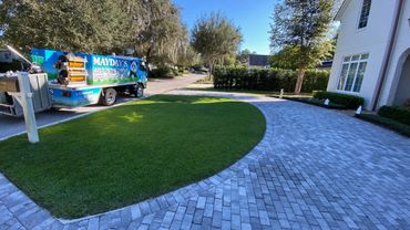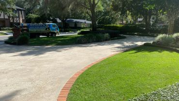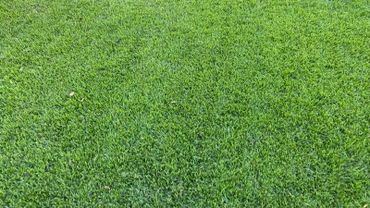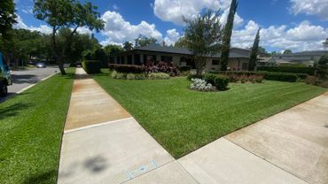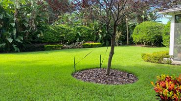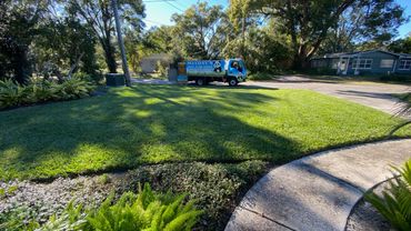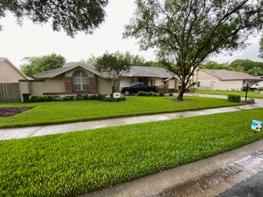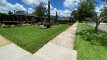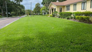 Well-maintained green lawn with trees and shrubs in a suburban neighborhood.