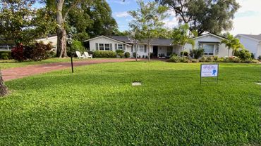 A sunny suburban yard with a lush green lawn and a pest control sign.